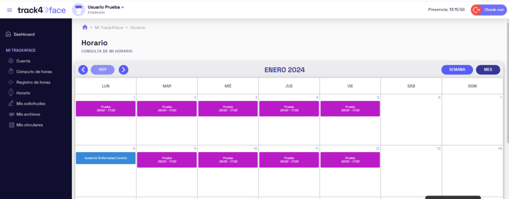 Si quieres saber cuál es el horario de tu jornada laboral, cuando tienes un festivo, una ausencia programada o te vas de vacaciones, la sección Horario es lo que buscas.